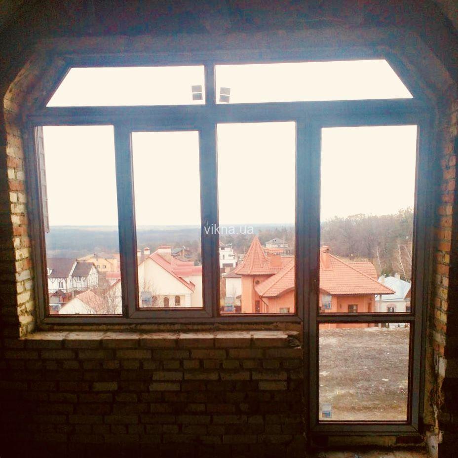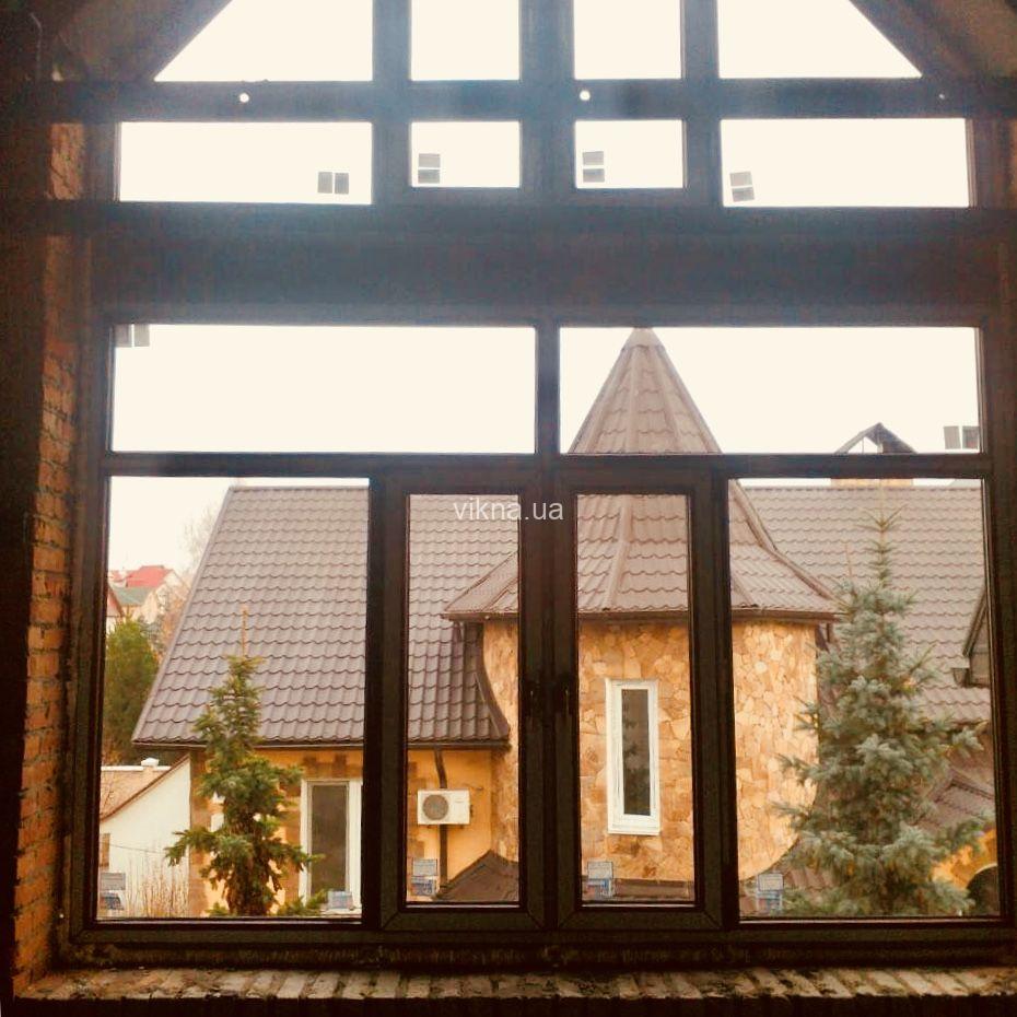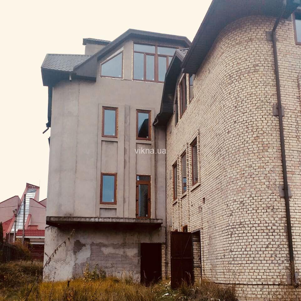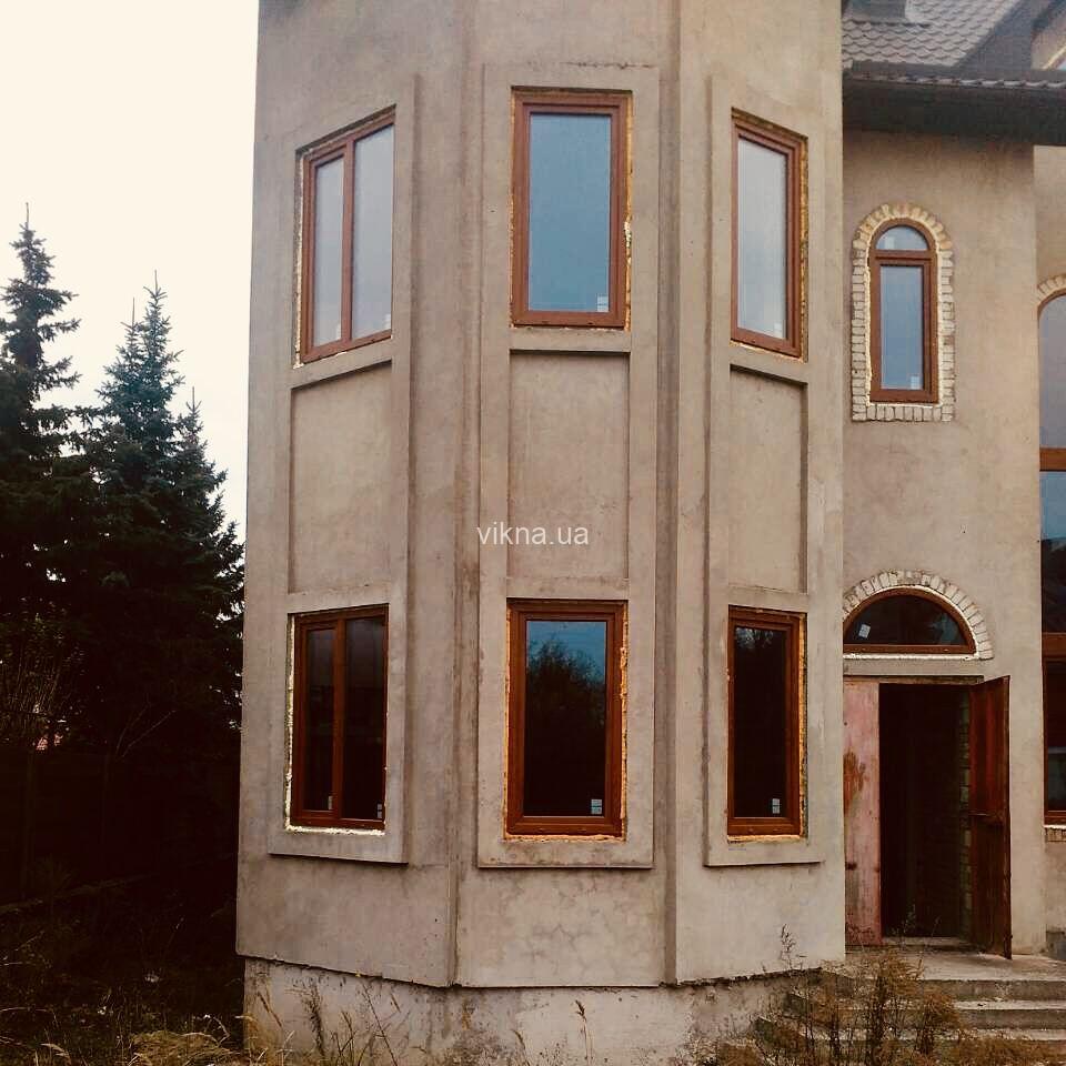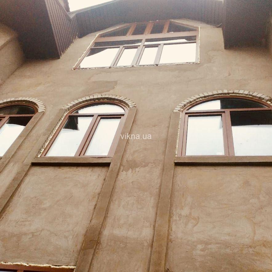 В одном заказе объединились все тонкости оконных технологий — ламинация (нанесение на окна декоративной пленки), конструкции большой площади и сложной геометрии (трапеции, треугольники, арки). К слову, монтаж верхних окон осуществлялся с использованием строительных лесов.